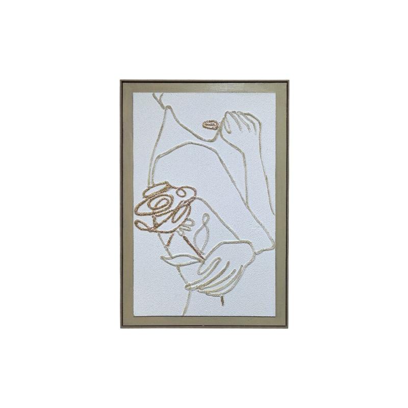 Tableau texturé représentant le corps d’une femme tenant une rose, dessiné en traits beige et or. La peinture granuleuse apporte un relief subtil, donnant profondeur et élégance à cette œuvre délicate et contemporaine. Une pièce artistique parfaite pour embellir un intérieur avec finesse.