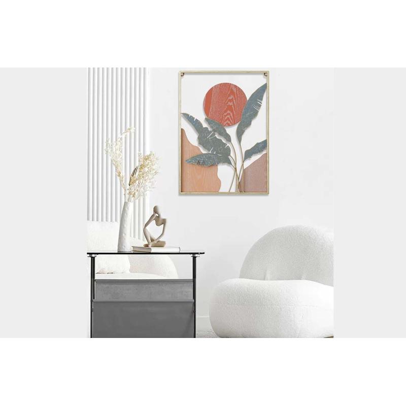 Cette décoration murale représente un paysage en arrière-plan et un feuillage exotique de bananier. Mélangeant le métal et le bois dans des teintes de terracotta, son design tendance s'accorde avec une décoration intérieure moderne.