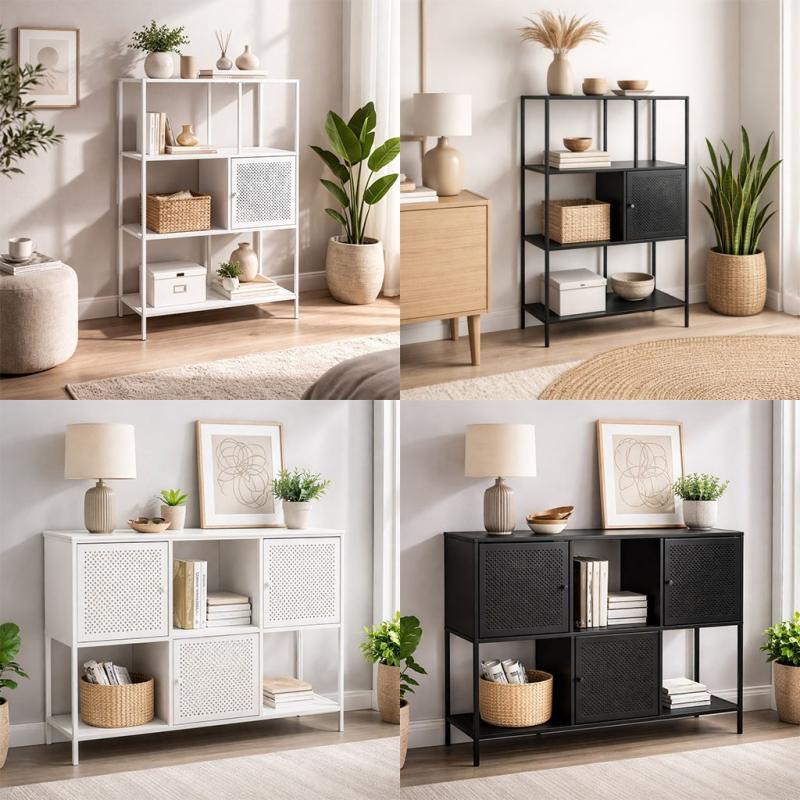 Fabriquée en bois MDF et métal, sa structure robuste offre une solution de rangement élégante pour divers espaces tels que le salon, la chambre ou le bureau.