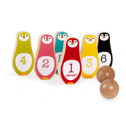 Jeu de quilles en bois pour toute la famille ! Avec leur forme de pingouins, elles vont plaire aux petits comme aux grands ! Contient : 6 quilles, 2 boules (45 mm de diamètre) et un sac en coton.